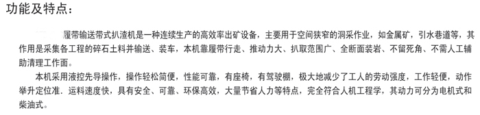 SDB-60S履带输送带式扒渣机是一种连续生产的高效率出矿设备,主要用于空间狭窄的洞采作业,如金属矿,非金属矿,引水巷道等,其作用是采集各工程的碎石土料并输送、